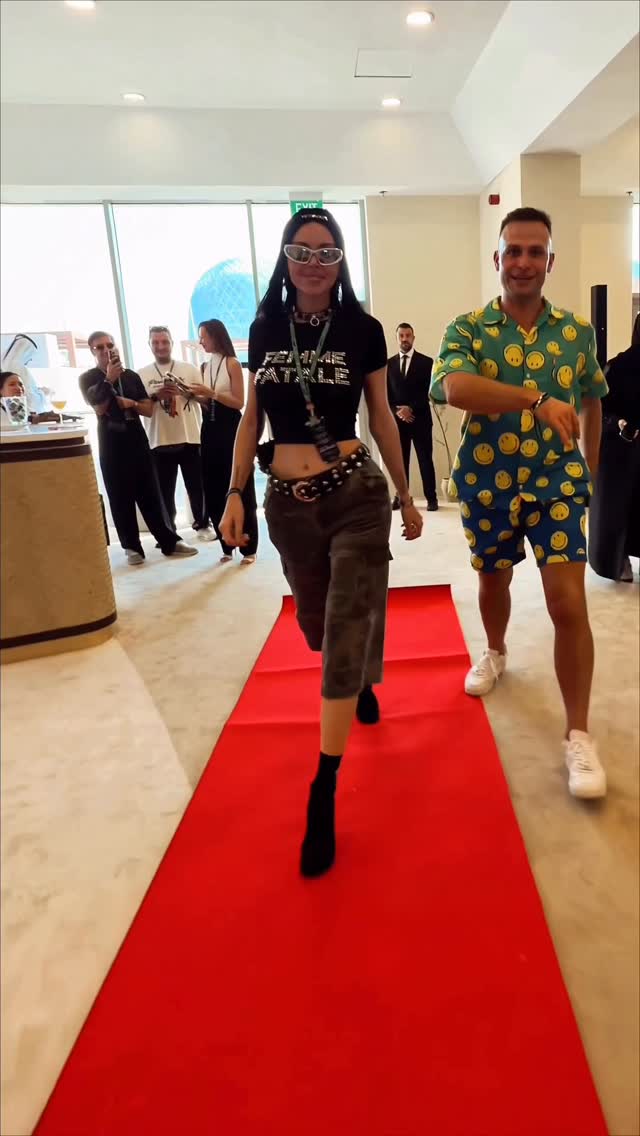 37-летняя знаменитость предстала на размещенных кадрах в полный рост в компании латвийского блогера Андрея Чернуцкого. Она прошлась по красной ковровой дорожке в черном кроп-топе со стразами и брюках капри с камуфляжным принтом.
