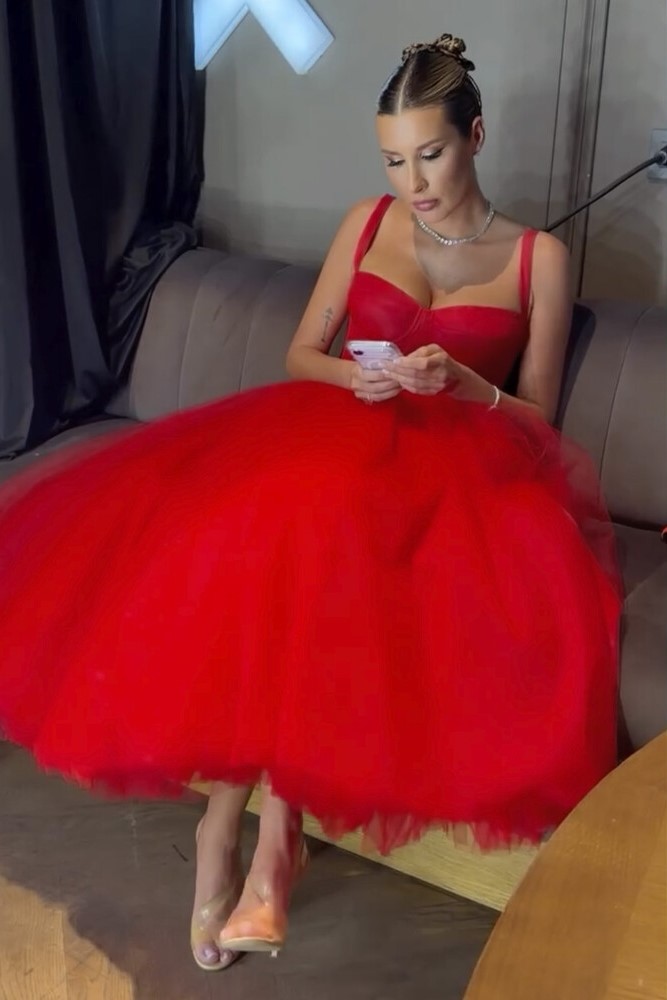39-летняя Кети Топурия была запечатлена в красном макси-платье с глубоким декольте и пышной юбкой. Певица также надела прозрачные босоножки на каблуках, браслет и ожерелье с бриллиантами. Поп-исполнительница предстала перед камерой с уложенными волосами и макияжем с черными стрелками, серебристыми тенями и розовой помадой.